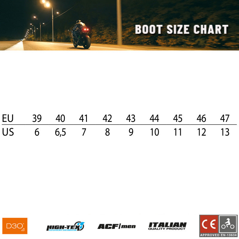 The styling of the Falco Patrol motorcycle boots enable them to easily span into the urban motorcycle shoe market with oil-treated leather and waterproofing features. The High-Tex Advanced Membrane is resistant to water penetration and is certified waterproof. The D3O® Impact Protection, developed in snow sports and the military industry, was first applied to motorcycle boots by Falco. "D3O Intelligent Molcules" flow freely when moving slowly but on shock, lock together to absorb impact energy. Transmitted force to ankle-foot area is significantly reduced thanks to D3O® exclusive support.