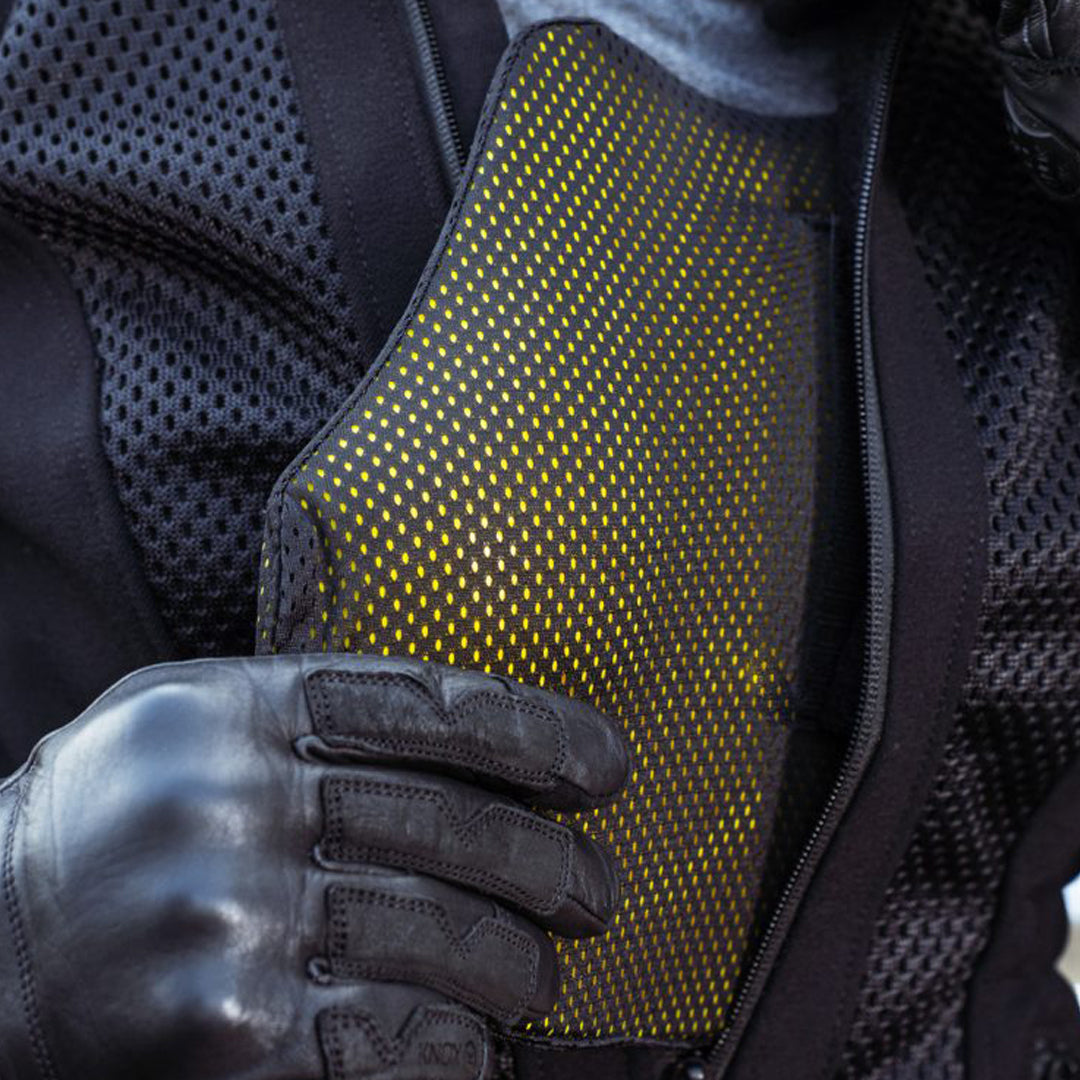 The optional upgrade of the Knox chest protector is courtesy of a low-profile Micro-Lock chest insert, designed to fit all Knox Armoured Shirts and Jackets via the VELCRO® strip. The Knox Micro-Lock chest protector offers a snug and soft-feel fit to the wearer, but thanks to its smart technology it locks in the case of an impact and absorbs a significant amount of energy before it gets to the wearer’s torso. It features a breathable, perforated design that is great for ventilation, and the removable soft mesh cover is washable to allow for fresh year-round wear. Available for both men and women's motorcycle apparel, they are CE Certified as a Level 1 protector.