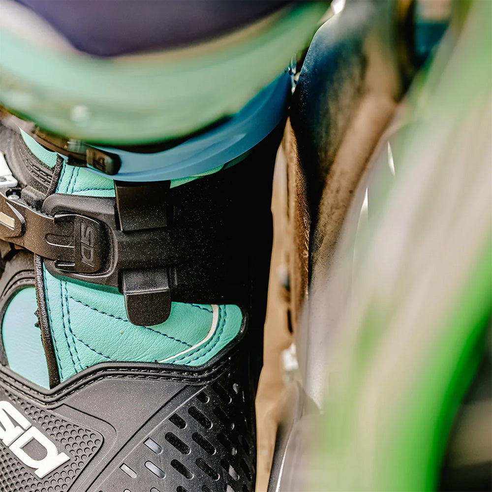 The Sidi Crossair X motocross boots deliver all of the support, control and protection without the extra burden. Designed for the rigors of MXGP and SX, the Crossair X features engineered microfiber construction that stands up to the toughest conditions. An outstanding level of safety is achieved with high-density impact protectors covering the entire boot in a light and flexible structure engineered to perform. A fiberglass exoskeleton provides support during jump landing, and a 3-point anti-hyperextention system protects from dangerous movements. Premium nylon buckles ensure durable and tough closure system. The sole, powered by SuperCross- and MXGP-proven Materiis compound, provides an endless level of total grip and durability to tackle every circuit.